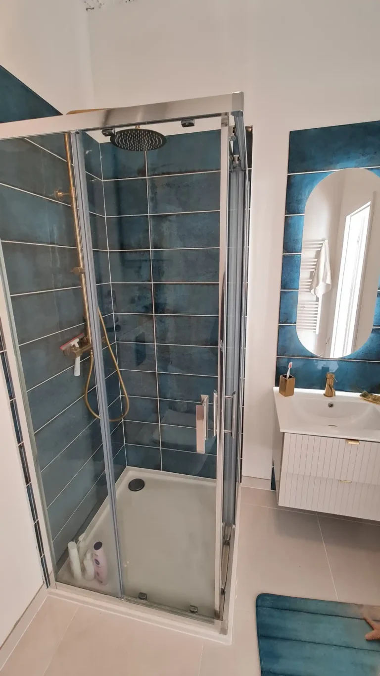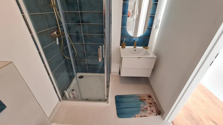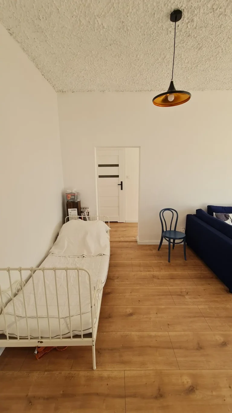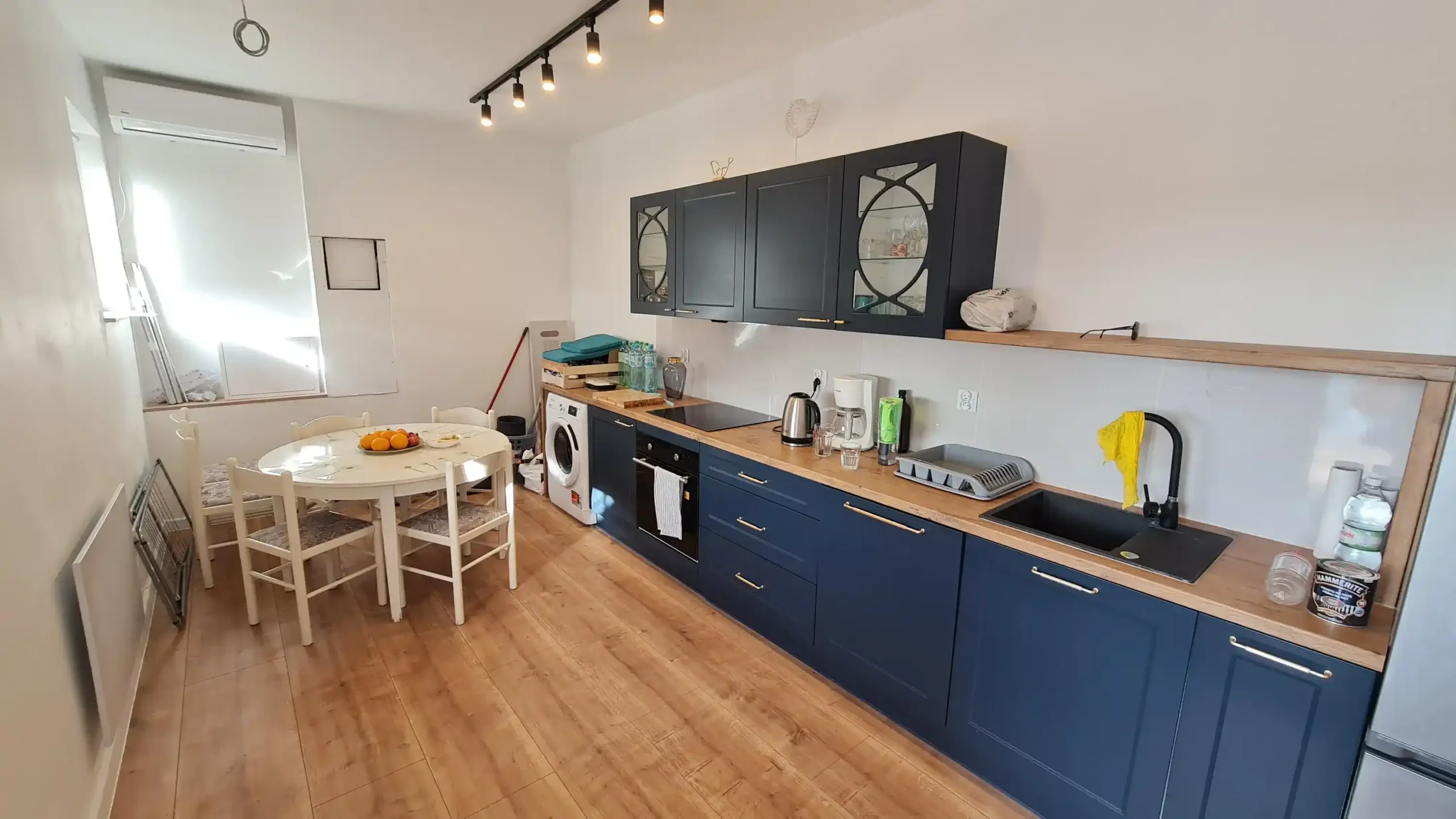 W sypialni czeka duże łóżko podwójne. W salonie dwie rozkładane sofy, apartament pomieści do 5 osób. Do dyspozycji masz pełną kuchnię z płytą, piekarnikiem, lodówką i zmywarką oraz łazienkę z prysznicem. Klimatyzacja, Wi-Fi i telewizor zapewniają codzienny komfort.